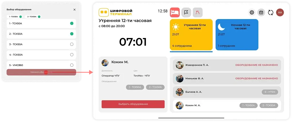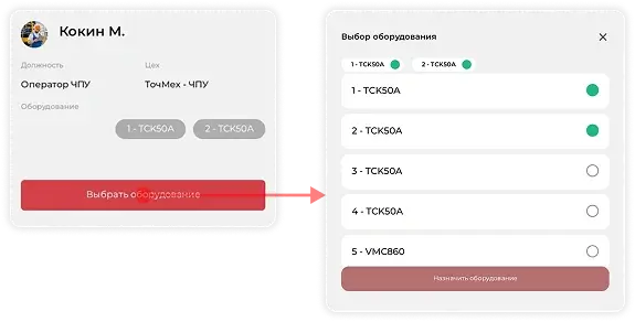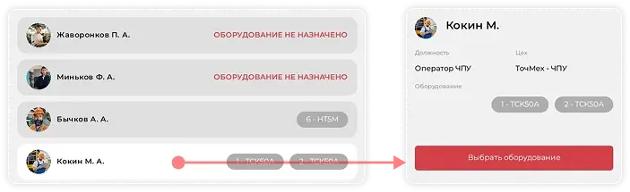 1. Для назначения оборудования сотруднику необходимо в блоке «Сотрудники на смене» выбрать сотрудника